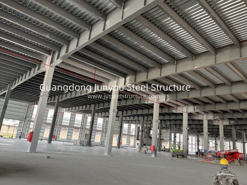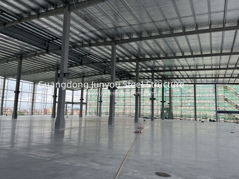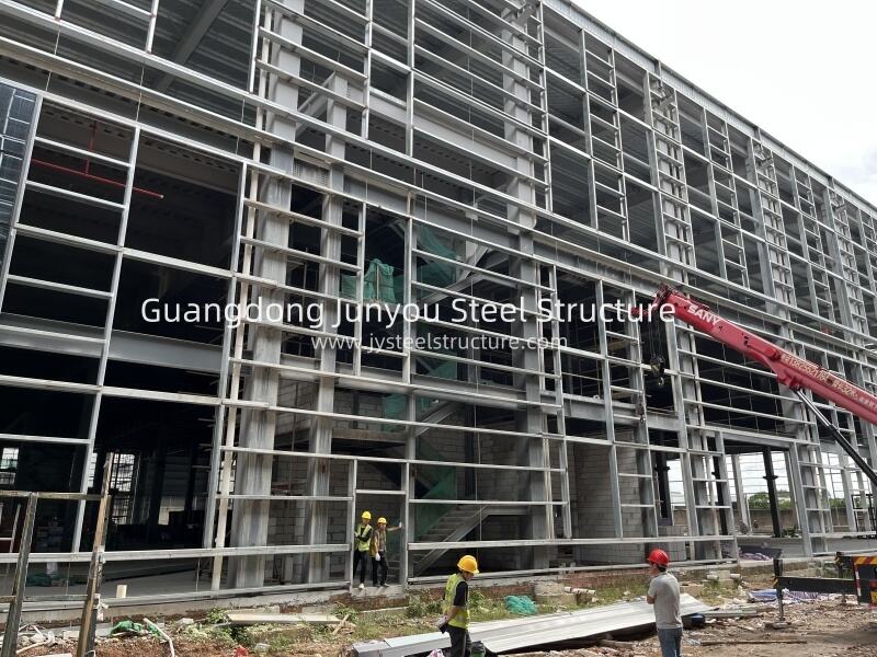 Ce bâtiment préfabriqué en acier à deux étages présente une hauteur exceptionnelle de 9 mètres par étage, atteignant une hauteur totale de 18 mètres. L'élément de conception inclut un espace de bureau de trois étages construit à l'angle du bâtiment métallique.